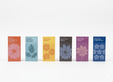 Alle sechs Sorten der Saatgutreihe von piccolo im Multipack. Diese Blumensorten sind enthalten.